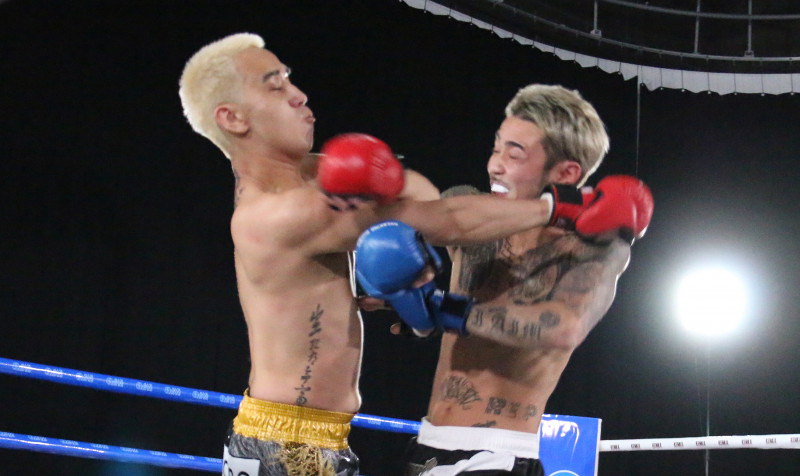 こめお(左)と高垣は互いに譲らぬ打ち合いを展開した