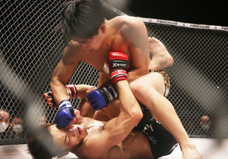 鶴屋が猿飛流の顔面にパウンドを落とす
