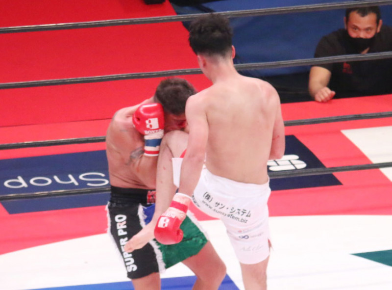 メイソンのヒザ蹴りがクラウスを襲う