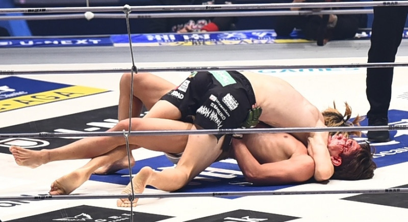 顔が血塗れになった瀧澤の首を締め上げる井上