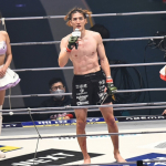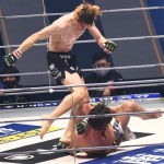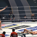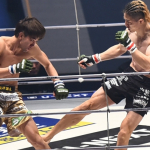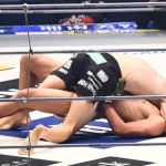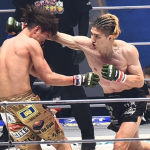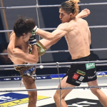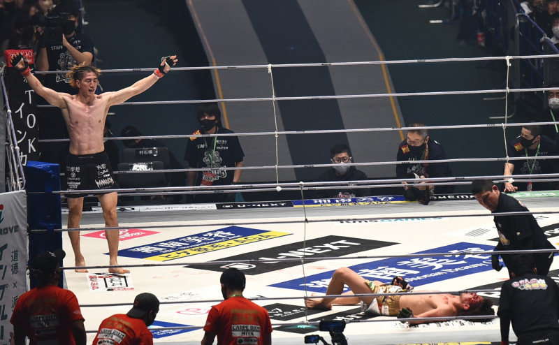 一本勝ちした井上(左)と、リングに倒れたままの瀧澤(右)