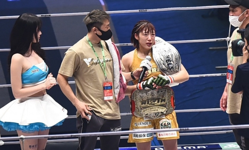 伊澤が勝利者コメント、婚約者のCORO(左)をマイクを持つ