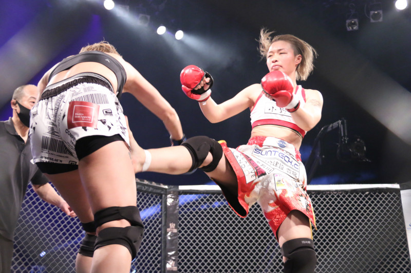 坂本が前蹴りで攻める