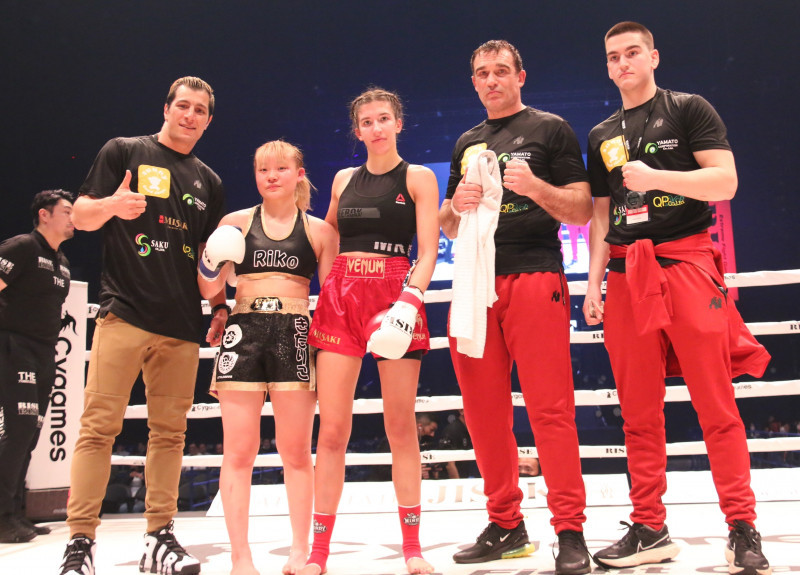 モンタナ(中央)と対戦相手のきたりこ(左から2番目)、父ピーター・アーツ(右から2番目)らが並ぶ