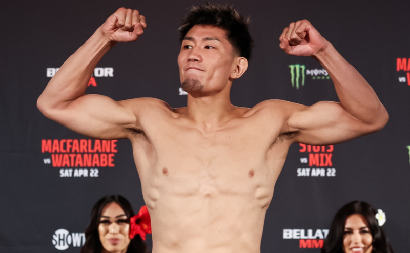 前日計量でマッスルポーズを決める菊入©️Bellator