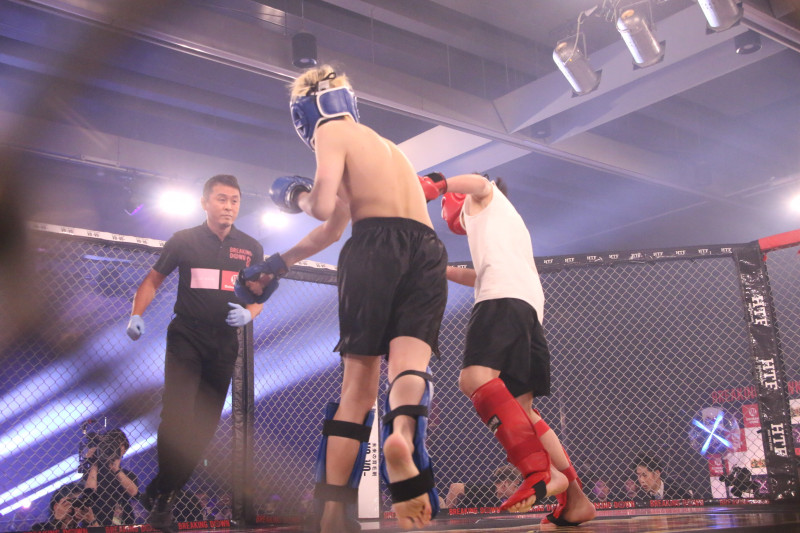 強烈なパンチを繰り出すOJ(左)