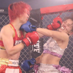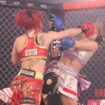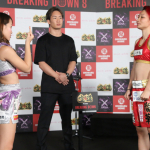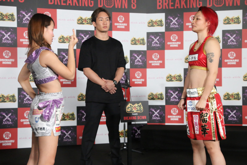 前日計量で原田(左)はこのポーズで坂本(右)を挑発