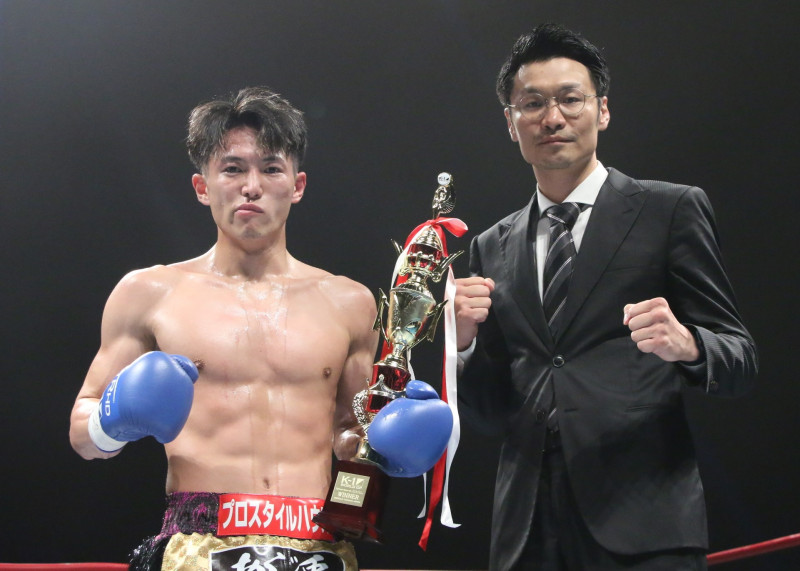 激闘を制した横山(左)、佐藤嘉洋と写真に収まる