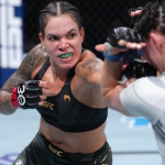 勝利後、グローブを外し、2本のベルトをマットに置くヌネス©️UFC