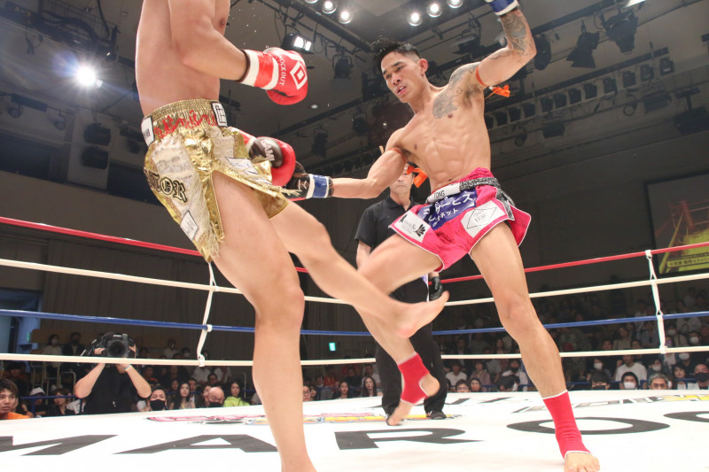 小笠原の蹴りでトンミーチャイがバランスを崩す