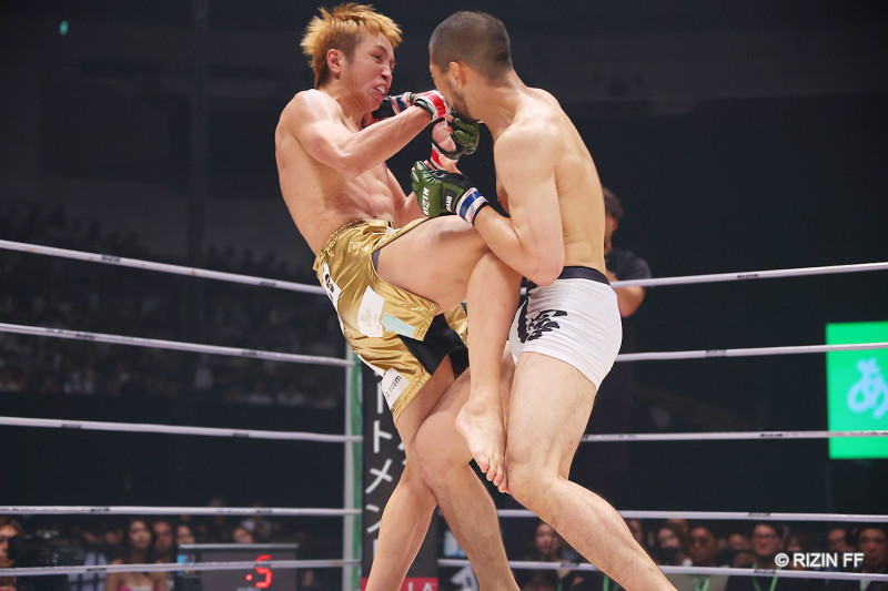 久保がカウンターのヒザを合わせる