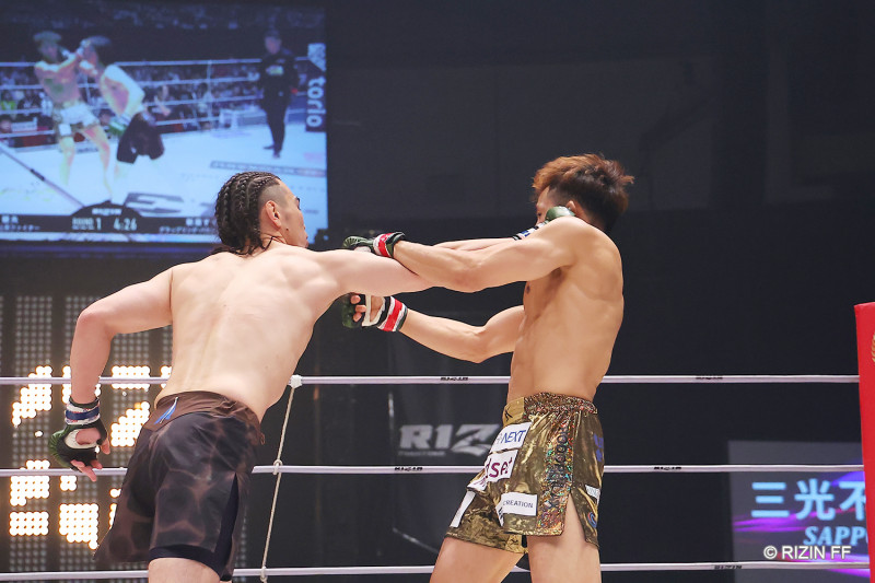 飯田がパンチを放つ