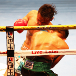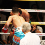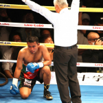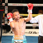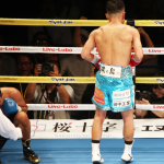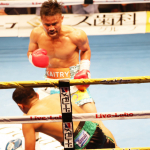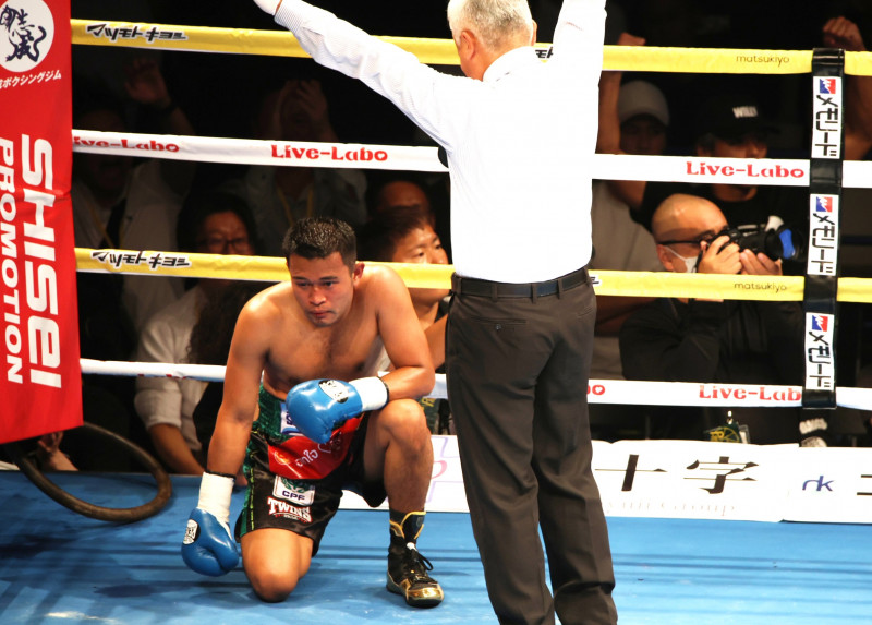 相手はたまらずダウン。10カウントで立ち上がれず比嘉のKO勝ち!