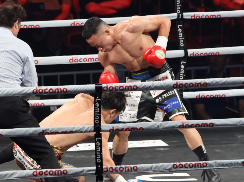 相手のスリップ後のパンチで注意を受けた岩下(右)