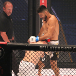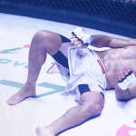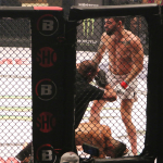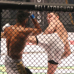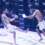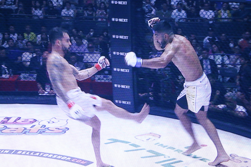 パトリッキーのカーフキックがヒット!(会場内スクリーンの写真)
