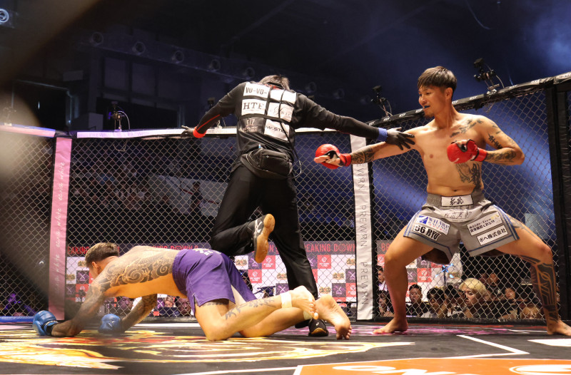立ち上がれない小林(左)、空手の残身を取るシモミシュラン’(右)