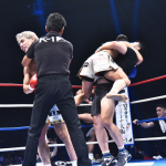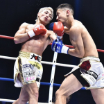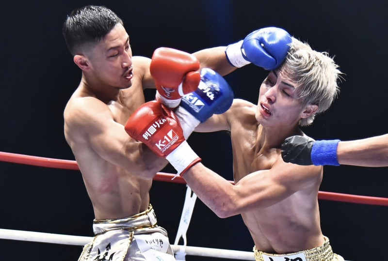 強烈なパンチを当てる伊藤(左)