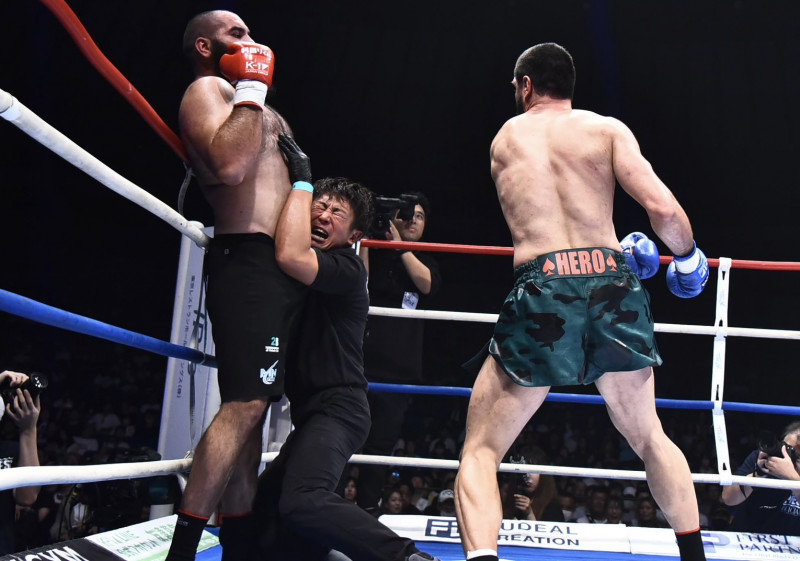 ゴングで止めようとしたレフェリーがカリミアンの攻撃を受けてダウン