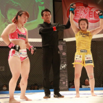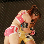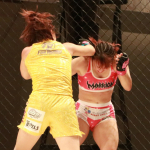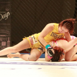 青野が桐生をケージへ押し込む