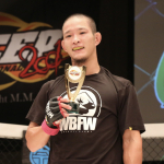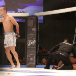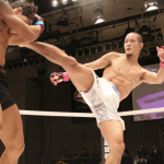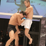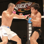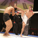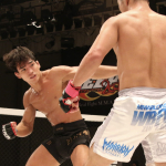 青井(左)、サッカーボールキックでTKO勝利