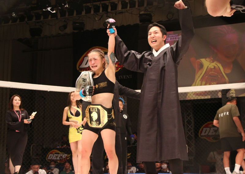 DEEP女子アトム級のベルトを奪取し喜ぶシユン