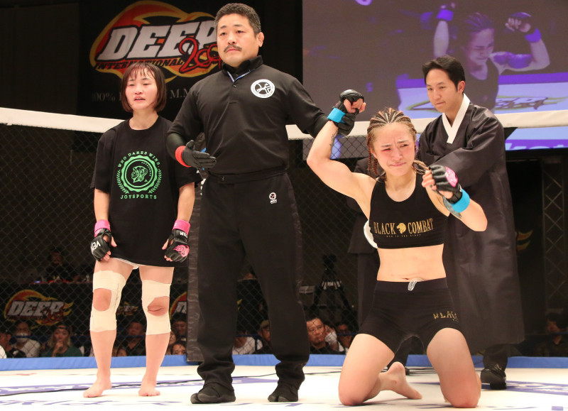 敗れて呆然とする大島(左)、王座戴冠で号泣するシユン(右)
