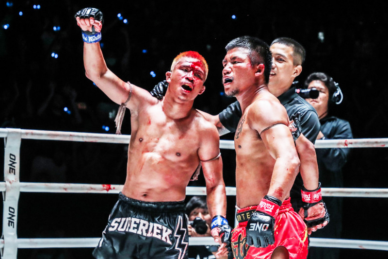 激闘の直後、流血しながらも勝利を信じるスーパーレック(左)、ダウン奪われ茫然のロッタン(右)©️ONE