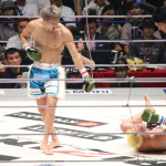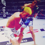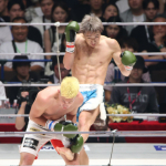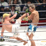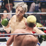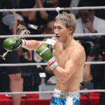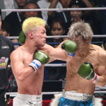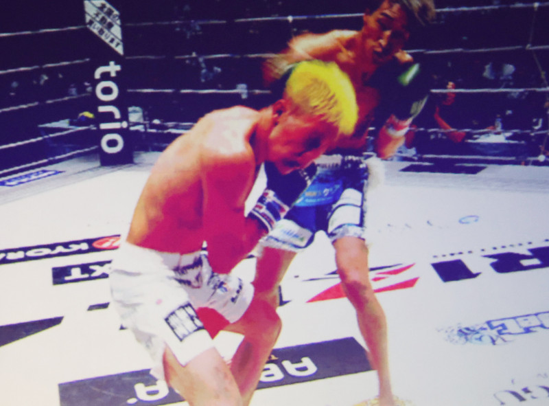最初のダウンを奪った右ストレート(会場の大型ビジョンより)