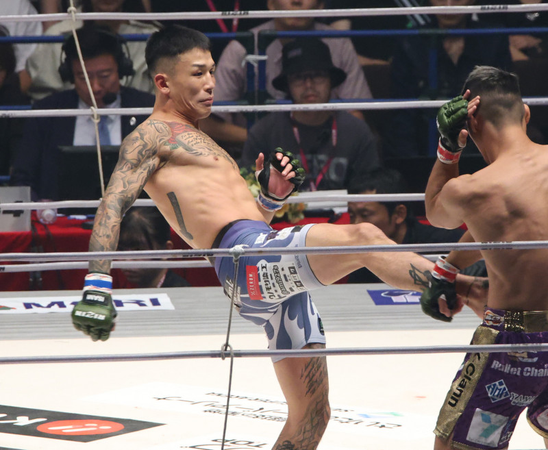 1R、前蹴りを入れる萩原、しかし徐々に牛久ペースへ