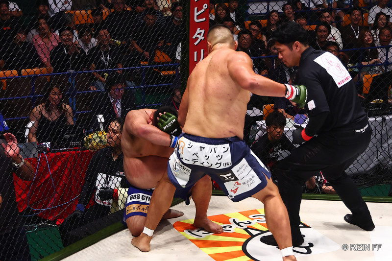 1R、貴賢神のストレートを被弾、荒東の腰が落ちる