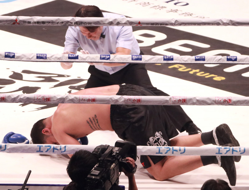 うずくまるオカンドー。カウント10で起き上がれず