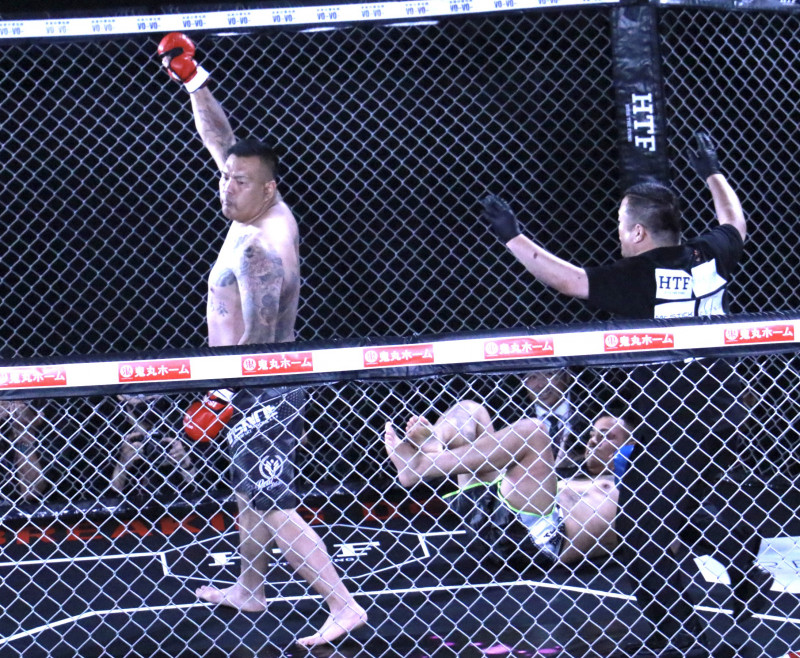 爆音の右フックでアンドレ(右)がダウン