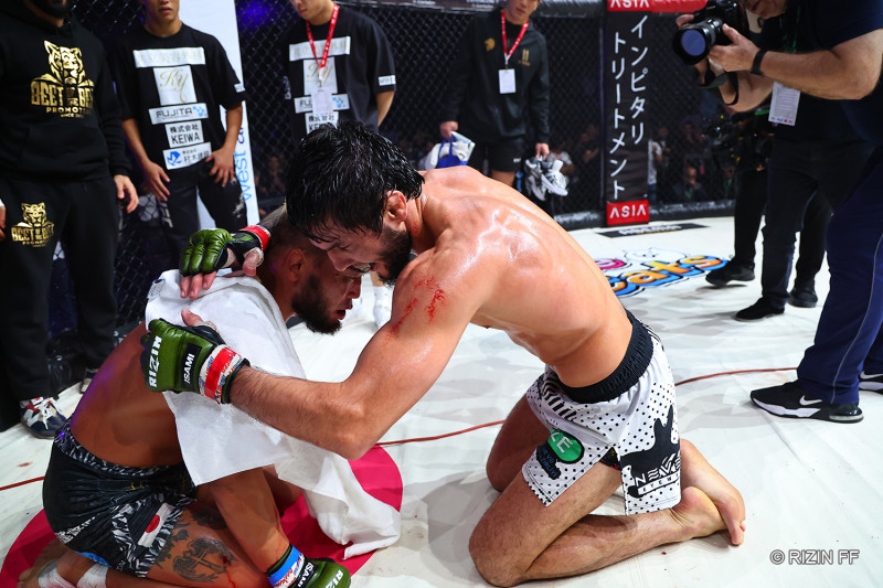 KO勝利したムサエフ、武田と健闘を称え合う©️RIZIN