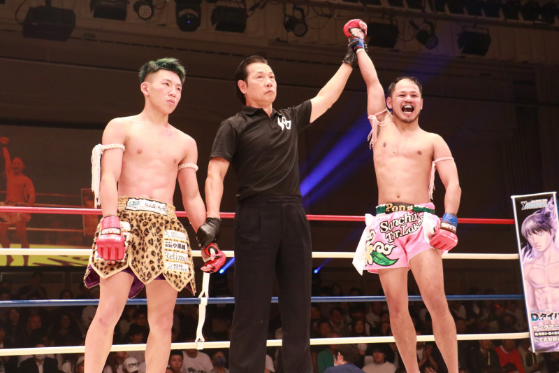 元ラジャ王者サンチャイ(右)が、現役KNOCK OUT王者の乙津に判定勝利
