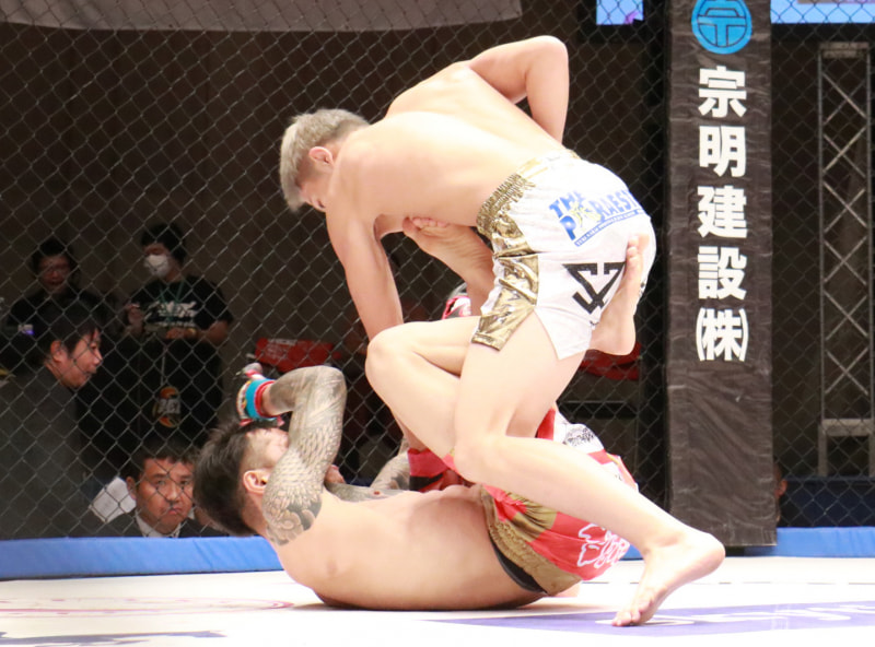 秋元が田口に上からパンチを浴びせる