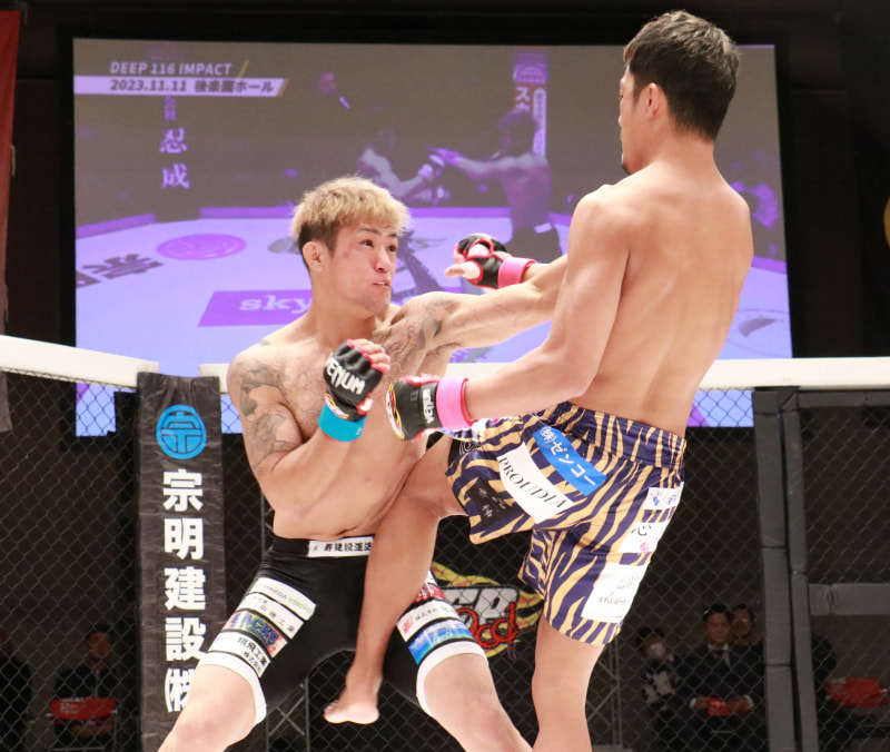 谷岡がパンチ、力也はヒザ蹴りを入れる