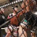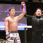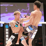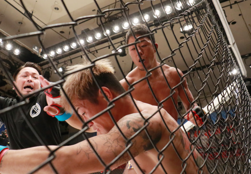 力也(上)が強烈なパンチで谷岡をKO!