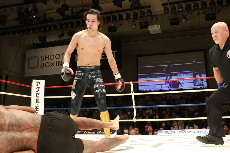 海人のヒザ蹴りでグランダーがダウン