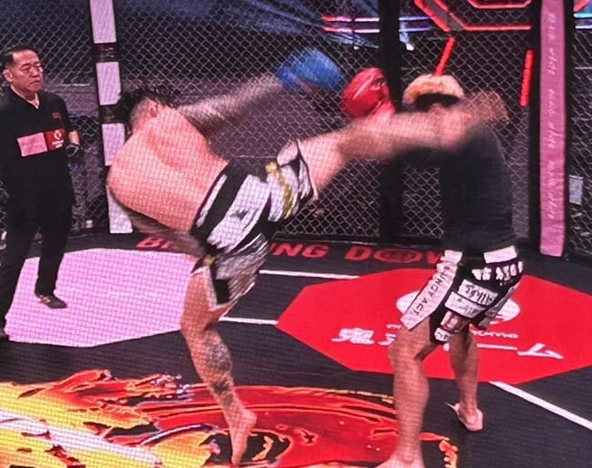 樋口(右)に左ハイキックをヒットさせるカンジ
