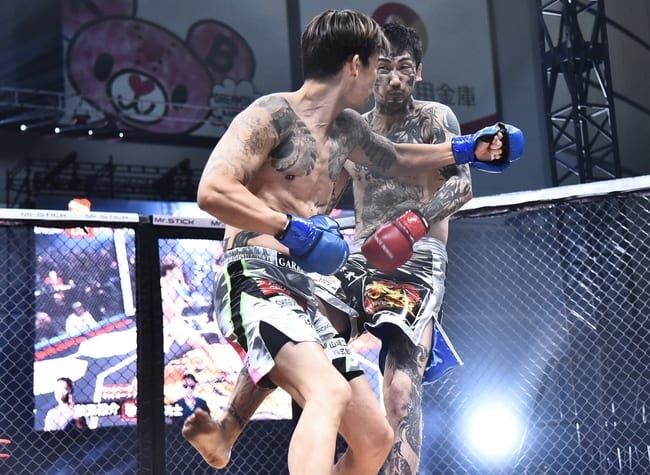 萩原がパンチを放つ