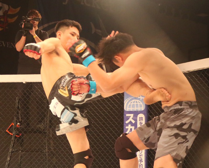 信原のミドルキックがヒット!