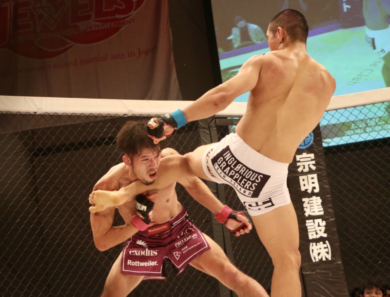 ピナクルが上迫のテイクダウン狙いに蹴りを合わせる