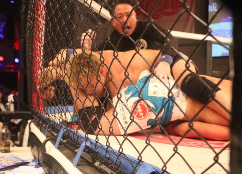 腕十字が極まり、レフェリーストップ