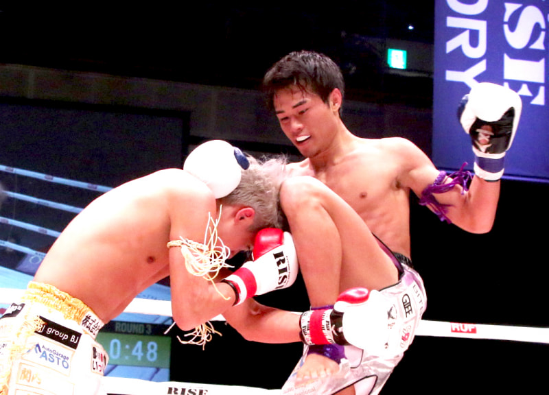ヒザ蹴りを当てる池田