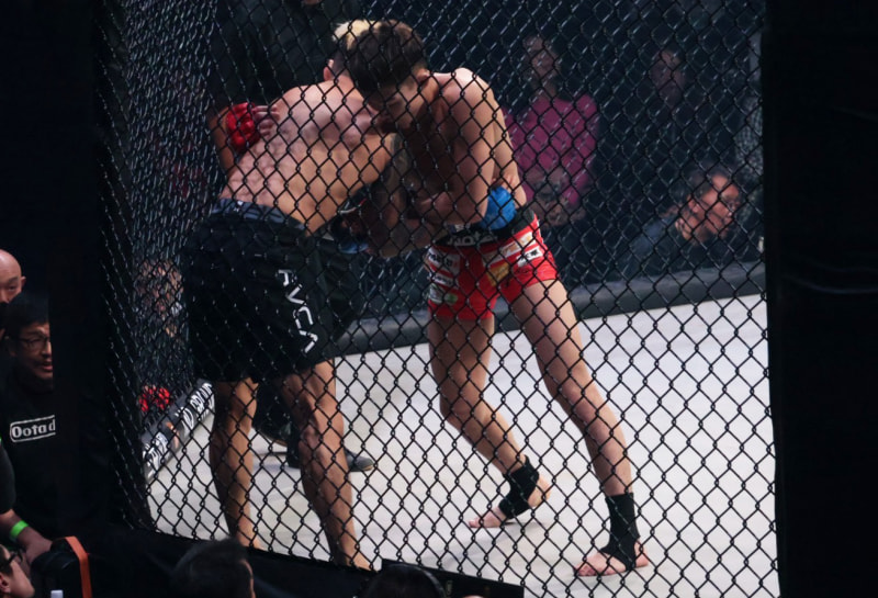 田嶋が金網に押し込む