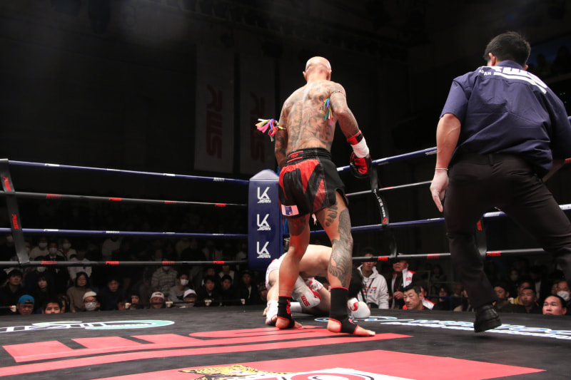 パルコの右ヒザでウジハラが悶絶ダウン、KO勝利を飾った