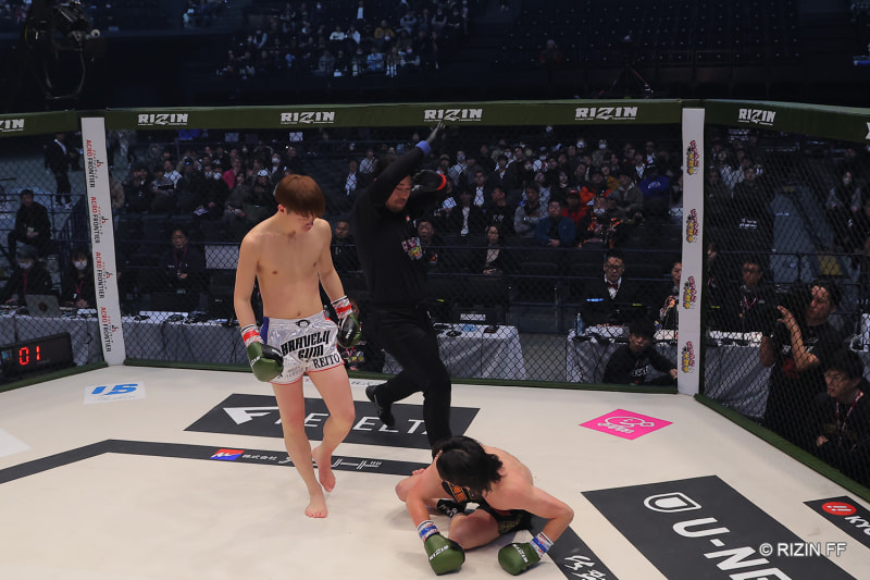 左ストレートで古村からダウンを奪う