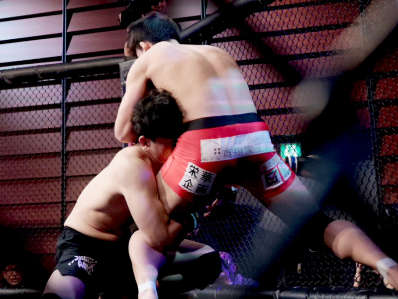 シングルレッグからテイクダウンを狙う中谷(左)