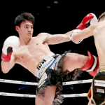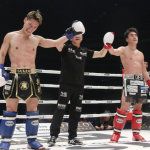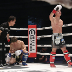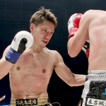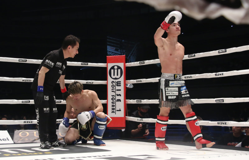 急遽エキシビションマッチでまさかのダウンを奪った大﨑(右)