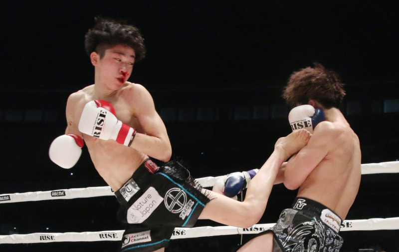 流血しながらもキックで攻める松本